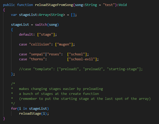 reloadStageFromSong() function is used to associate stages to songs. You can create an array of stages to be preloaded with the song that can later be changed between without any lag. The LAST stage in the array is the one thats gonna be loaded in last so keep that in mind.