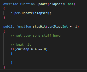 stepHit (in sync with the song) or update (constant) functions. There is also a conditional in stepHit that allows you to run a smaller beatHit function. This can be useful for animated sprites, for example.