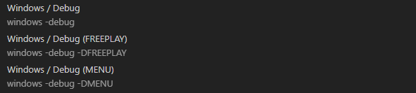 -debugcan build the game in debug mode. This enables many debug features, such as the FlxDebugger and debugging through VSCode.-DFREEPLAYand-DMENUlaunch the game directly in the Freeplay and MainMenu states, respectively. These can't be used together.